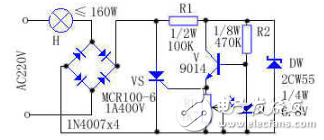 工作原理:电路如上图所示,220V交流电通过灯泡H及整流全桥后,变成直流脉动电压,作为正向偏压,加在可控硅VS及R支路上。白天,亮度大于一定程度时,光敏二极管D呈现底阻状态≤1KΩ,使三极管V截止,其发射极无电流输出,单向可控硅VS因无触发电流而阻断。此时流过灯泡H的电流≤2.2mA,灯泡H不能发光。电阻R1和稳压二极管DW使三极管V偏压不超过6.8V,对三极管起保护作用。夜晚,亮度小于一定程度时,光敏二极管D呈现高阻状态≥100KΩ,使三极管V正向导通,发射极约有0.8V的电压,使可控硅VS触发导通,灯泡H发光。RP是清晨或傍晚实现开关转换的亮度选择元件。