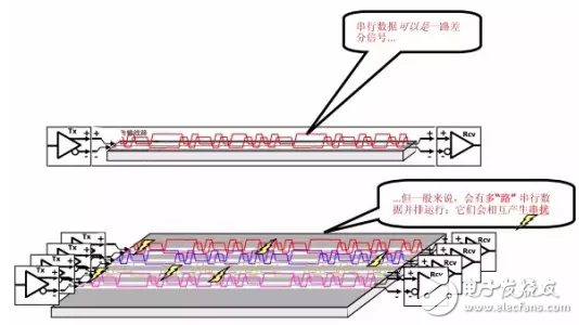 串扰是指当信号在传输线上传播时,因电磁耦合对相邻的传输线产生的不期望