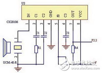 超声波接收电路如图4所示。这是本系统设计和调试的一个难点。压电陶瓷型超声波接收器 UCM-40-R 接收反射的超声波转换为40kHz毫伏级的电压信号,需要经过放大、处理、才能用于触发单片机中断。一方面传感器输出信号微弱,由于反射条件不同,需要放大倍数的范围大约是100~5000,另一方面传感器输出阻抗较大,需要高输入阻抗的多级放大电路,而高输入阻抗容易接收干扰信号。通常采用两种方案:一是采用运算放大器组成多级选频放大电路;二是采用专用的集成前置放大器。第一种方案容易产生自激振荡,要使接收电路达到很好灵敏度和抗干扰效果,电路的调试是较困难的。本系统采用专用的集成电路前置放大器 CX20106,它由前置放大器、限幅放大器、带通滤波器、检波器、积分器、整型电路组成。其中前置放大器具有自动增益控制功能,可以保证在超声波传感器接收较远反射信号输出微弱电压时放大器有较高的增益,在近距离输入信号强时放大器不会过载。调节芯片引脚5的外接电阻R3,将它的滤波器的中心频率设置在 40kHz,达到了很好的效果。当接收到与滤波器中心频率相符的信号时,其输出引脚7输出一个低电平,而输出引脚7直接接到MSP430F2274的 P2.2上,以触发中断。