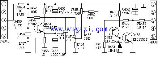 彩电枕校电路原理图 采用此枕校电路的机型有:韩国三星MC-15机芯、金星C6418、V6458、牡丹64C1、乐华CT6388W等。 场锯齿波电压经P404的(4)脚送到枕校电路,R455、C454、R457组成积分电路,对场锯齿波积分,形成上凸的抛物波电压,加到抛物波整形放大管Q451的B极,经放大、整形后从C极输出9V(峰-峰值)的下凹抛物波电压,然后经VR451、VR452、R464、R46
