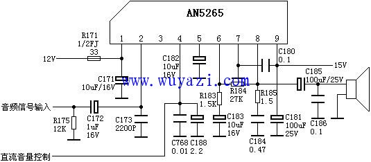 N5265引脚功能电压及电路图 N5265引脚功能及参考电压: 1脚:12V——前置级电源 2脚:5V——音频信号输入端 3脚:0V——静音控制端(高电平时静音) 4脚:0.1V——音量控制电压输入端 5脚:7V——滤波端 6脚:7.4V——负反馈输入端