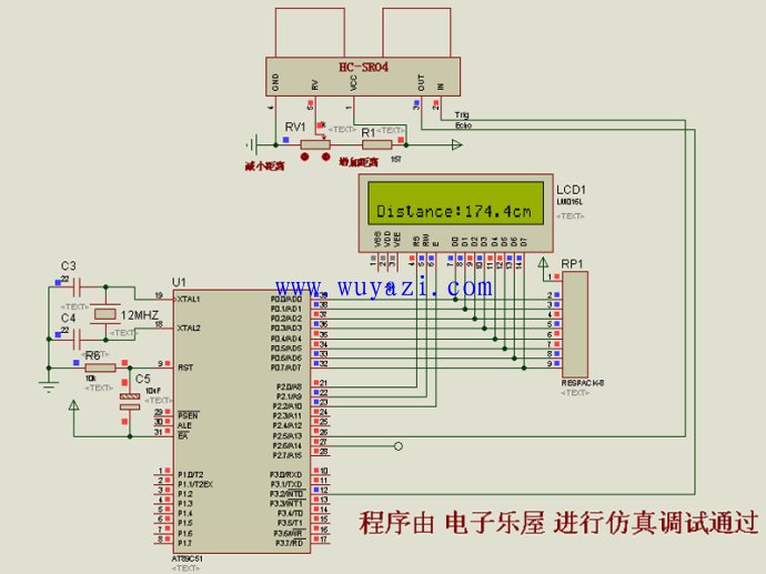 制作超声波测距仪,是很多学生、单片机爱好者学习单片机动手实践的一个实作项目,这款超声波测距程序,针对目前比较广泛使的HC-SR04超声波模块而设计的,这款1602显示的超声波测距距源程序,单片机是51系列单片机,超声波测距模块先用的是HC-SRO4 超声波测距模块,单片机的晶振是12M,接线:模块TRIG接 P2.5 ECH0 接P3.2,当距离超出测量时,范围显示“-”,显示单位是CM。这款程序由于硬件比较简单,制作时焊接工作量小,几乎是百分之百的成功,也可以用PROTEUS软件直接进行。