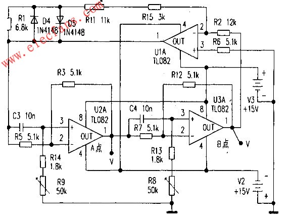 A点为U2A的输出波形。B点为U3A的输出波形。从仿真结果不难看出。A点刚好比B点的相位延迟90度,信号经过U3A再移相90度后。刚好移相180度。此时B点和U1A输出的相位刚好相差180度。电路要求C3、R8和C4、R9两个网络参数的值要完全相同才会获得最理想的波形。由于笔者没有相关仪器,无法测量正弦波的失真度,但是从软件仿真和硬件实验来看,输出波形还是挺让人满意的。