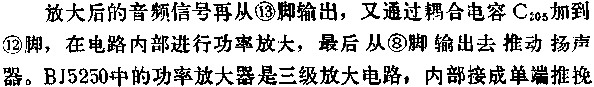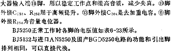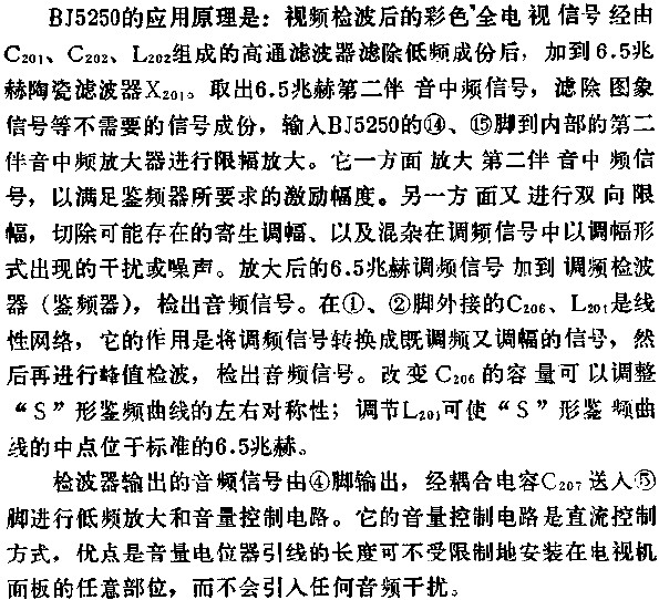 BJ5250是伴音通道采用的集成电路,它包含了第二伴音中频放大,限幅,鉴频,低频放大和功率放大等伴音电路的全部功能.它提供的最大音频输出功率为2.5W.应用实例如图所示.