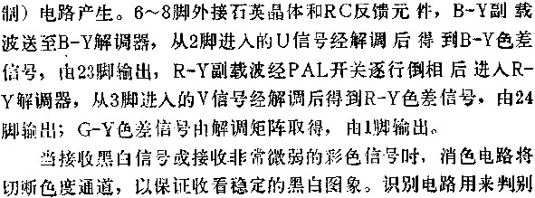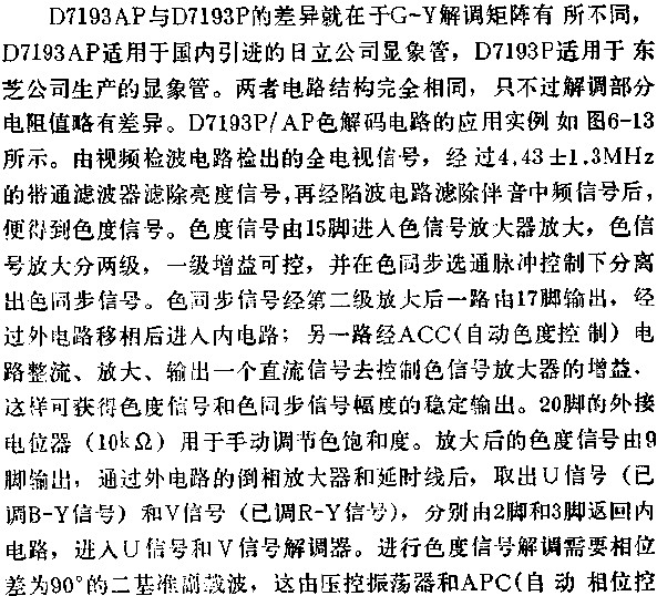 D7193P/AP为PAL制彩色电视机的色度信号处理和解码电路.它具有色信号放大,色同步信号分离,自动色度控制和色信号解调等功能.