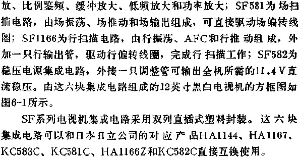 SF系列电视机中的集成电路共有六块.它们是SF1144,SF1167,SF583,SF581,SF1167和SF582.其中SF1144担负一中放,二中放,1F AGC和RS AGC延迟;SF1167担负三中放,检波,消隐,预视放,同频分离和1F AGC门控