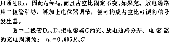 图中是用555时基集成电路组成的可调占空比的方波信号发生器线路。“时基集成电路组成振荡器电路图”例中,电容器通过RA+RB串联电阻充电