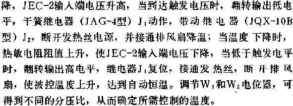 图中所示是用JEC-2组成的自动恒温箱电路。它在20~80度范围内控制温度,误差极小,因此可用于雏鸡孵化等及其它简易温控场合。图示线路当温度升高时,探头上热敏电阻阻值下