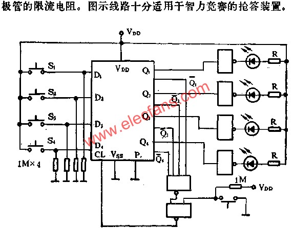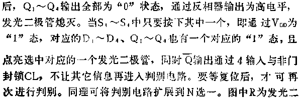 四选一判别电路即那个信号第一到达,且点亮指示灯,封锁所有其它信息,即其它信息来了,也是无效的。