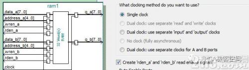 这里可以设置时钟方案,而读使能rden并非必须信号。当使用rden信号时,此信号高电平有效,当不使用rden信号时,给定地址,下一个脉冲数据从q端口送出。