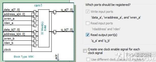 这里的设置非常重要,当选中read output ports时,q端会增加一级寄存器。虽然这样增加流水线能够提高电路的速度,但同时从读使能有效到最终数据有效将会多延迟一个时钟周期。在设计中要格外注意。根据设计自行设置。