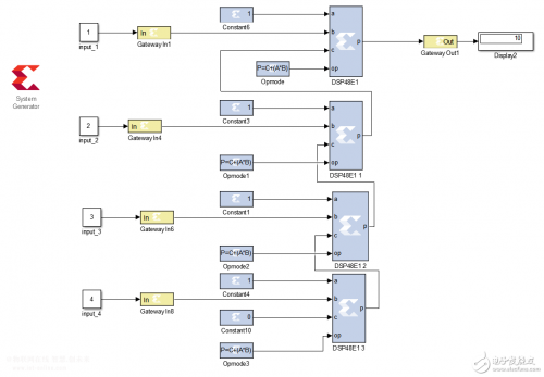 利用4个dsp48e1模块,实现四路加法器,dsp48e1模块在手册中表示比较复杂,找了两个图,可以大致看懂他的基本功能。