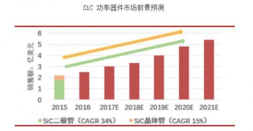 预测,至 2025 年:碳化硅 MOSFET 市场规模将会超越 3 亿美元,成为仅次于碳化硅肖特基二极体的第二大碳化硅离散功率元件;SiC FETs 与 BJTs 产品获得市场信赖,但多应用于专业或小众产品,规模远低于 SiC MOSFET 市场;结合 SiC 二极管与 Si IGBT 所形成的混合式 SiC 功率模组, 2015年该产品市场销售额约为 3,800 万美元,预计 2025 年销售额将会突破 10 亿美元。