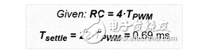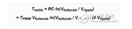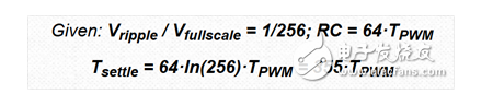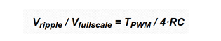 每个PWM DAC设计都需要模拟滤波,以将需要的直流分量(与PWM占空比成比例)与不需要的交流纹波分开。最简单的方法是采用基本的RC低通滤波器,它给出峰峰值纹波幅度(这是针对50%PWM占空比的最坏情况,其中TPWM=PWM周期时间,并假设RC》TPWM):