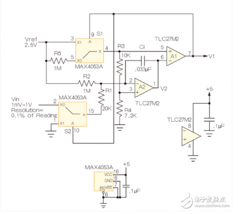 聪明的读者会注意到,在T2期间,当S1从A1的“+”输入中剔除Vref时,R5产生了一个42mV的正偏压。这种偏置的目的是,尽管使用单极性电源,也要使A2的输出一直到T2斜线的末端都保持有效。