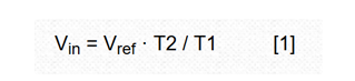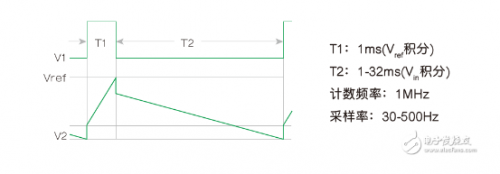 这里,对Vref按固定的时间间隔T1进行积分。然后将积分器输入切换到-Vin,并测量回降到零所需的时间T2。从而: