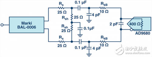 将单端转换为差分模式可通过宽带巴伦BAL-0006SMG实现。简单看下BAL-0006SMG数据手册,显示它具有6 dB插入损耗。继巴伦之后的匹配网络(Rs和RSH)添加了另一个6 dB。该匹配网络需要提供宽带匹配至巴伦输出。ADC (RkB)前方的串联电阻呈现少量插入损耗。该电阻通过降低ADC采样级到保持级的反冲来提高第三次谐波性能。