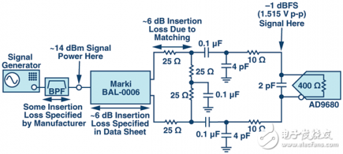 因此,让我们克服相关ADC难题以了解信号发生器获得–1 dBFS ADC信号时所需功率。50 Ω基准电阻用于以下数学方程。对于1.7 V p-p的默认满量程电平,–1 dBFS信号为1.515 V p-p。由于10 Ω电阻损耗相当小,我们可以假设该损耗电压为端接网络电压。巴伦端接具有6 dB损耗,因此巴伦的每一侧摆幅约为1.515 V的两倍。这导致单端输入约为3.03 V p-p。因此,信号发生器须提供对应于约3.03 V p-p或14 dBm的信号。请注意,这不包括带通滤波器或连接器电缆的插入损耗。因此,再次看下图1,这次我们通过一些注释得到图2。