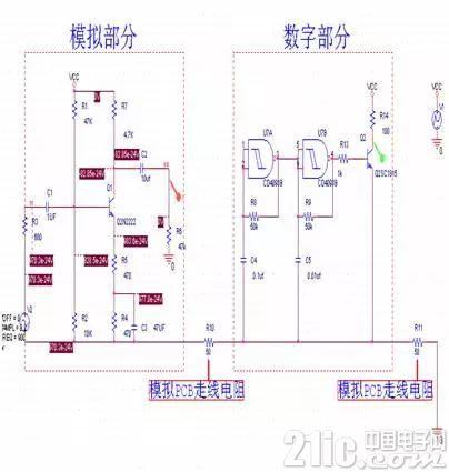 我这里面用两个电阻来代PCB上走线的电阻…我想有人肯定会说,这不是扯蛋吗,PCB上的电阻哪有这么大.50欧…哈哈.在这里我为了 大家看的更直观一些,所以用这么大…实际上是不会有这么大的…但相对于频率高的电路来说,有时候导线的阻抗远小于感抗!!!那就可能会产生这么大 的电阻了.这里是数字电路接在后面