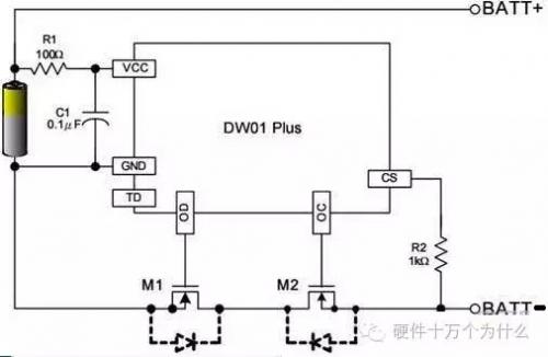 该电路主要由锂电池保护专用集成电路DW01,充、放电控制MOSFET1(内含两只N沟道MOSFET)等部分组成,单体锂电池接在B+和B-之间,电池组从P+和P-输出电压。充电时,充电器输出电压接在P+和P-之间,电流从P+到单体电池的B+和B-,再经过充电控制MOSFET到P-。在充电过程中,当单体电池的电压超过4.35V时,专用集成电路DW01的OC脚输出信号使充电控制MOSFET关断,锂电池立即停止充电,从而防止锂电池因过充电而损坏。放电过程中,当单体电池的电压降到2.30V时,DW01的OD脚输出信号使放电控制MOSFET关断,锂电池立即停止放电,从而防止锂电池因过放电而损坏,DW01的CS脚为电流检测脚,输出短路时,充放电控制MOSFET的导通压降剧增,CS脚电压迅速升高,DW01输出信号使充放电控制MOSFET迅速关断,从而实现过电流或短路保护。