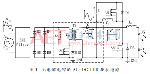 当单级电源已经实现了很高的功率因数时,在LED电源的输入端和输出端之间就会存在能量之间的平衡。为了适应这一能量的差异,一个大容量电容不可缺少,电解电容器的寿命大大限制了LED电源的使用寿命,因此消除电解电容器是很有意义的。