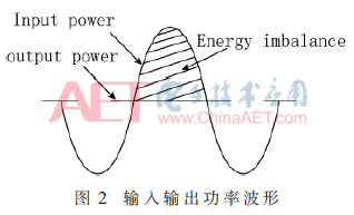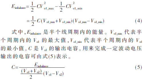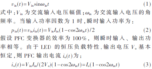 图2显示了在半个线周期内电源的输入输出侧双方存在能量的不平衡。这种能量的不平衡由PFC输出端的低频纹波电流显示出来。LED电源的全部能量几乎都是由Vo1输出来的。能量的不平衡和电压波动的关系可以由式(4)表示: