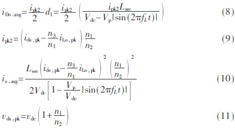 通过D2的平均电流由式(8)给出,ipk2由式(9)给出,平均输入电流可以由式(10)给出,它表明输入电流的形状受到Vp和Vdc的比例影响。当Vdc接近Vp时,输出电流变得更加扭曲。