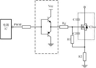 MOSFET因导通内阻低、开关速度快等优点被广泛应用于开关电源中。MOSFET的驱动常根据电源IC和MOSFET的参数选择合适的电路。下面一起探讨MOSFET用于开关电源的驱动电路。   在使用MOSFET设计开关电源时,大部分人都会考虑MOSFET的导通电阻、最大电压、最大电流。但很多时候也仅仅考虑了这些因素,这样的电路也许可以正常工作,但并不是一个好的设计方案。更细致的,MOSFET还应考虑本身寄生的参数。对一个确定的MOSFET,其驱动电路,驱动脚输出的峰值电流,上升速率等,都会影响MOSFET的开关性能。   当电源IC与MOS管选定之后,选择合适的驱动电路来连接电源IC与MOS管就显得尤其重要了。   一个好的MOSFET驱动电路有以下几点要求: (1)开关管开通瞬时,驱动电路应能提供足够大的充电电流使MOSFET栅源极间电压迅速上升到所需值,保证开关管能快速开通且不存在上升沿的高频振荡。   (2)开关导通期间驱动电路能保证MOSFET栅源极间电压保持稳定且可靠导通。   (3)关断瞬间驱动电路能提供一个尽可能低阻抗的通路供MOSFET栅源极间电容电压的快速泄放,保证开关管能快速关断。   (4)驱动电路结构简单可靠、损耗小。   (5)根据情况施加隔离。   下面介绍几个模块电源中常用的MOSFET驱动电路。   1、电源IC直接驱动MOSFET   图1 IC直接驱动MOSFET   电源IC直接驱动是我们最常用的驱动方式,同时也是最简单的驱动方式,使用这种驱动方式,应该注意几个参数以及这些参数的影响。第一,查看一下电源IC手册,其最大驱动峰值电流,因为不同芯片,驱动能力很多时候是不一样的。第二,了解一下MOSFET的寄生电容,如图1中C1、C2的值。如果C1、C2的值比较大,MOS管导通的需要的能量就比较大,如果电源IC没有比较大的驱动峰值电流,那么管子导通的速度就比较慢。如果驱动能力不足,上升沿可能出现高频振荡,即使把图 1中Rg减小,也不能解决问题!IC驱动能力、MOS寄生电容大小、MOS管开关速度等因素,都影响驱动电阻阻值的选择,所以Rg并不能无限减小。   2、电源IC驱动能力不足时 如果选择MOS管寄生电容比较大,电源IC内部的驱动能力又不足时,需要在驱动电路上增强驱动能力,常使用图腾柱电路增加电源IC驱动能力,其电路如图 2虚线框所示。