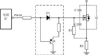 图4改进型加速MOS关断   在第二点介绍的图腾柱电路也有加快关断作用。当电源IC的驱动能力足够时,对图 2中电路改进可以加速MOS管关断时间,得到如图 4所示电路。用三极管来泄放栅源极间电容电压是比较常见的。如果Q1的发射极没有电阻,当PNP三极管导通时,栅源极间电容短接,达到最短时间内把电荷放完,最大限度减小关断时的交叉损耗。与图3拓扑相比较,还有一个好处,就是栅源极间电容上的电荷泄放时电流不经过电源IC,提高了可靠性。   4、驱动电路加速MOS管关断时间