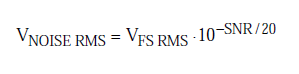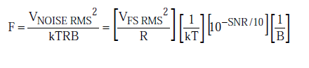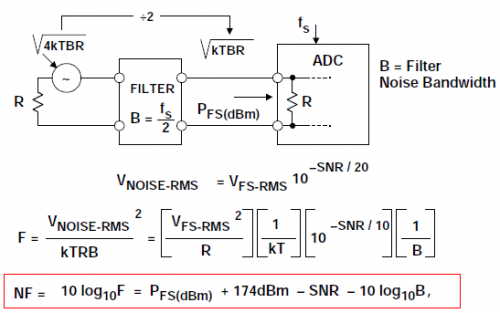 NF计算的第一步是根据ADC的SNR计算其有效输入噪声。ADC数据手册给出了不同输入频率下的SNR,确保使用与目标IF输入频率相对应的值。此外还应确保SNR数值中不包括基波信号的谐波,有些ADC数据手册可能将SINAD与SNR混为一谈。知道SNR后,就可以从下式开始计算等效输入均方根电压噪声: