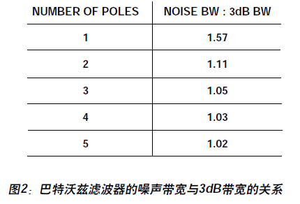 等式3 对滤波器的噪声带宽B需要加以进一步的讨论。非理想砖墙滤波器的噪声带宽指的是让相同的噪声功率通过时,理想砖墙滤波器所需的带宽。因此,一个滤波器的噪声带宽始终大于其3dB带宽,二者之比取决于滤波器截止区的锐度。图2显示了最多5极点的巴特沃兹滤波器的噪声带宽与3dB带宽的关系。注意:对于2极点,噪声带宽与3dB带宽相差11%;超过2极点后,二者基本相等。