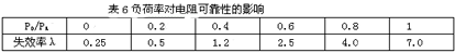 由表5可知,当PD/PR=0.8时,失效率比0.2时增加了1000倍。 3.2.2 负荷率对电阻的影响 负荷率对电阻的影响如表6所示。