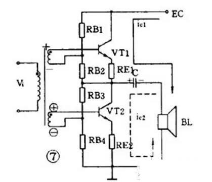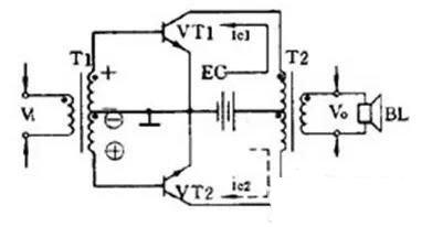 负载电阻是低阻抗的扬声器,用变压器可以起阻抗变换作用,使负载得到较大的功率。 这个电路不管有没有输入信号,晶体管始终处于导通状态,静态电流比较大,困此集电极损耗较大,效率不高,大约只有 35 %。这种工作状态被称为甲类工作状态。这种电路一般用在功率不太大的场合,它的输入方式可以是变压器耦合也可以是 RC 耦合。 3.2 乙类推挽功率放大器 下图是常用的乙类推挽功率放大电路。