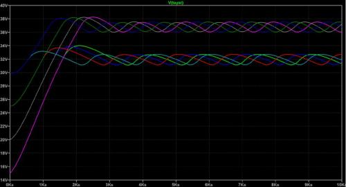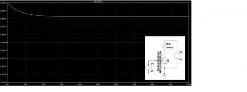 我们对初始温度(Tinit)和最终的稳定循环温度(Rset)值进行两次扫描,以获得期望的系统温度结果,范围是从初始温度(15°C、20 °C、30 °C和35 °C)开始,并在由Rset值定义的温度(32 °C和37 °C)附近摆动。   我们可以验证一个微妙但并非不重要的细节:如图1的应用图所示,其中用一个开关电源(VP-P)来防止热敏电阻器的自加热,这在我们的仿真中也有使用。我能通过将初始温度设为25 °C并监测系统温度变化来验证这个事实;结果是一条平坦的线条,表明热敏电阻器绝对没有出现自加热。   我们来隔离包含图中热敏电阻器的分压器,并验证在向其施加6 V时会发生什么情况(参见图4中嵌入的电路)。我们看到在100秒过后,NTC上的电压下降,表明存在自加热。由于开关电源输入,我们避免了这一现象,我们的建模用图形方式表示了这一点。