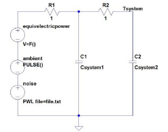 图1   现在我们将用一个热的系统(图2)来完善这个电路,该系统的行为类似于几个电容器 / 电阻器,且其温度V(Tsystem)必须进行调节。为此我们对该系统施加由图1的负载(模拟行为V=F() 源)所产生的等效电功率,其中有一部分耗散到周围环境(脉冲源或分段线性文件,因为我们将评估环境温度变化对我们系统的温度控制的影响)。为给建模过程增加一点趣味,这个环境温度将出现一些噪声,在这里用带有文件(可以产生一些噪声的分段线性文本文件)的PWL源来模拟。