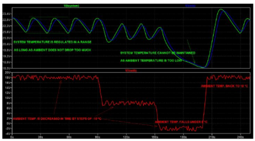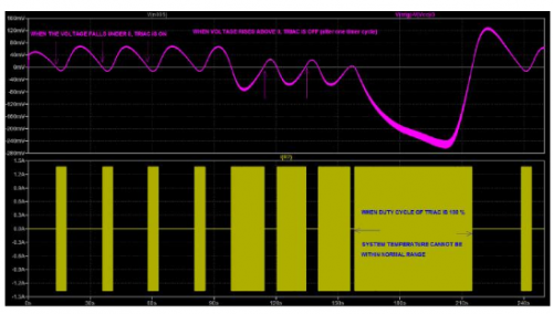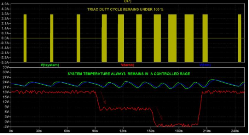 图5   图5代表系统的时间以及和NTC热敏电阻器温度(上方)以及和环境温度的实时变化经。结果综合如下。   该仿真的输入是一个描述环境温度变化(带1 °C随机噪声)(从18 °C经过90秒,到8 °C(90秒内),再到-2 °C,最终回到18 °C,带1 °C随机噪声)的文件(图5的下方窗格)。   系统的温度调节首先在18 °C环境温度时进行,加热元件使系统温度在前90秒内在21.4 °C和23 °C之间摆动(图5的上方窗格)。电流在双向晶闸管导通周期期间流过加热元件(图4的上方窗格),这些导通周期在V(trig)-VCC/3 > 0的时间范围内(图4的下方窗格)。V(trig) 与热敏电阻器上的电压有直接联系,后者跟随系统温度而变化,但具有由响应时间定义的一些延迟{tau} (R9)。但有一些延迟,这个延迟由响应时间{tau} (R9)来定义。   当环境温度降至8 °C,系统温度循环会轻微变化,但我们看到双向晶闸管的占空比出现增加。这时需要更多功率来使系统温度与环境温度一样低。   到目前为止,一切都在按计划进行。   当环境温度降至-2 °C时,双向晶闸管的工作时间增至100%,意味着输送功率达到最大值。但是,在此情况下这还不足以使系统温度在正常范围之内,系统温度出现下降,随后是NTC热敏电阻器。仅当环境温度在仿真结束时回到18°C,我们才能看到温度循环再度出现。   我们的结论是,我们需要减小加热元件的电阻值,以便提供更大的功率多电能。图6是Rheat = 100 W时的仿真。现在我们看到,无论环境温度如何,我们都能保持所期望的系统温度摆动。
