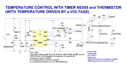 第一部分:NE555将SPICE动态生成的系统温度维持在限制范围内 Alain Stas现任Vishay非线性电阻器产品营销工程师,此前曾在布鲁塞尔自由大学(ULB)研究生物化学过程的数学建模。Alain拥有布鲁塞尔自由大学土木工程物理学硕士学位,专业是固态电子学。   借助此模型,我们想发布有关几种老式温控模拟电路LTSpice建模的一系列技术说明书。虽然这现在看来不是那么创新,但通过实况实时的和,与时间无相关的方式来模拟这些电路产生的温度却具有开创性。在这些电路中,从ON/OFF控制开始,一直到更复杂的PID温度控制,皆以简单电路来产生系统(房间/炉子/冰箱)的温度,然后通过热敏电阻器进行动态感测,并通过模拟器件(如定时器或模拟PID控制器)进行调节。