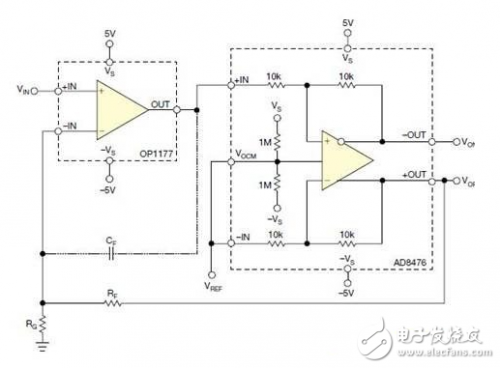 将RF短路,RG开路,可以设定为最低增益2。 与任何反馈连接相同,必须非常注意确保系统的稳定。OP1177与AD8476的级联构成了一个组合式差分输出运放,其开环增益是OP1177开环增益与AD8476闭环增益的乘积。因此,AD8476的闭环带宽为OP1177的开环增益加了一极。为确保稳定性,AD8476的带宽应高于OP1177的单位增益频率。当电路的闭环增益大于2时,这个要求可以放松,因为电阻反馈 网络可有效地将OP1177的单位增益频率降低RG/(RG+RF)。AD8476的带宽为5MHz,而OP1177的单位增益频率为1MHz,因此电路在任何增益下都不会有稳定性问题。 当使用单位增益频率远大于差分放大器带宽的运放时,可以插用一个带宽限制电容CF,如图所示。电容CF与反馈电阻RF构成一个积分器,整个电路的带宽则为: