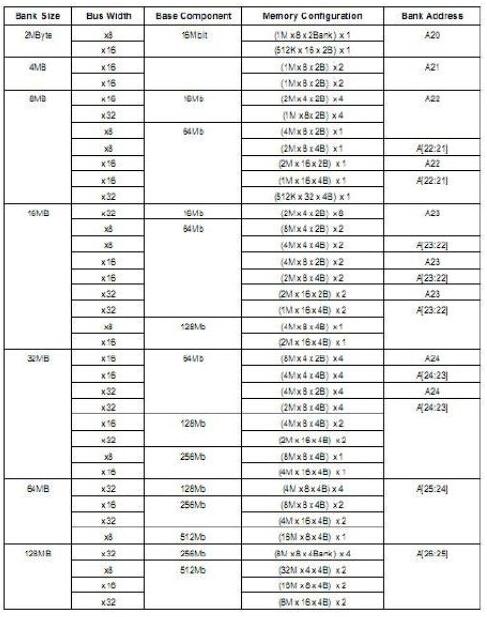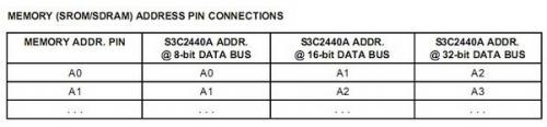 图2 SDRAM引脚配置方案 图2是S3C2440A手册提供的SDRAM bank地址的配置方案,维护系统使用的SDRAM是HY57V561620FTP-H,它的规格是4*4M*16bit(使用两片是为了配置成32位的总线宽度),BANK大小是4M*16=64MB,总线宽度是32位,器件大小是4*BANK大小=256Mb,寄存器配置就是(4M*16*4B)*2,根据图2可知,SDRAM上的BANK地址引脚(BA[1:0])与S3C2440的A[25:24]相连。