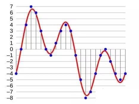图1:音频采样:蓝色点是红色模拟信号的样本。位深度垂直显示,采样率水平显示。图片来源:Wikipedia.org   另一个需要考虑的因素是文件压缩。音频文件的本机位率是每个音频通道(立体声是两个声道)的采样率和位深度的乘积。不过,文件的位率取决于其如何被压缩及编码。大多数音频文件都被压缩到一个便携设备上。通常,一个音频文件被压缩,并从一个巨大的波形音频文件(WAVE)(位率为每秒1411.4千比特),转换到一个类似MPS、Vorbis或无损音频解码器(FLAC)的较小的文件格式 (最大位率为320 kbps)。
