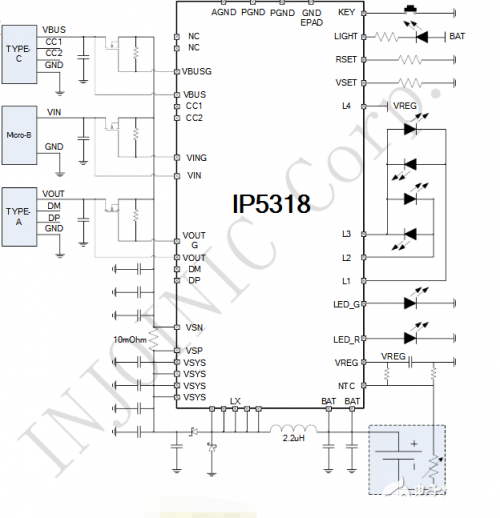 方案介绍 英集芯IP5318是一款集成type-c协议、QC2.0输出快充协议(兼容DCP识别功能,兼容BC1.2、苹果和三星手机)、同步升压转换器、锂电池充电管理、电池电量指示等多功能的电源管理SOC,为移动电源提供完整的电源解决方案。高集成度与丰富功能,只需一个电感实现降压与升压功能,使其在应用时仅需极少的外围器件,并有效减小整体方案的尺寸,降低BOM成本。同步开关升压系统可支持QC2.0快充,提供最大18W输出能力,转换效率高至96%。