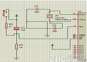 系统总电路仿真   模块电路设计:   最小系统由复位电路和时钟电路组成,时钟电路提供12MHZ时钟信号,复位电路采用手动按键复位电路,可以在不关闭电源的情况下对单片机进行复位。