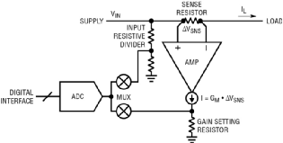 图1:测量电源轨上的输入电压和负载电流(检测电压)