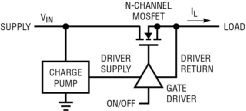 图2:用N沟道MOSFET实现电源轨的接通/断开 常见的电源总线也需要针对短路和过载故障提供保护,这类故障可能在任何板卡或模块中出现。为了实现电路断路器功能,可以比较图1中放大器的输出和一个过流门限,以断开图2中的栅极驱动器。这种方案取代了保险丝,因为保险丝反应速度慢、容限太宽且熔断后需要更换。为了节省电路板空间,人们希望在开关、保护和监视汽车电源总线中的功率流动时,采用集成式解决方案。