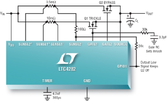 此外,LTC4282的双电流路径还用于使MOSFETSOA要求与导通电阻脱钩。大的SOA对于启动浪涌、电流限制和输入电压阶跃等具有巨大应力的情况是很重要的。当MOSFET栅极完全接通时,低的导通电阻可降低正常操作期间的电压降和功率损耗。不过,这些是存在冲突的要求,因为MOSFETSOA通常随着导通电阻的改善而变差。LTC4282允许采用一条具有一个能处理应力情况之MOSFET的路径,和另一条具有低导通电阻MOSFET的路径。这被称为一种分级起动配置。一般来说,在启动、电流限制和输入电压阶跃期间应力处理路径接通,而RDS(ON)路径则保持关断。RDS(ON)路径在正常操作过程中接通以旁路应力路径,为负载电流提供一条低导通电阻路径,从而减少电压降和功率损耗。视启动时MOSFET应力大小的不同,有两种分级起动配置,即低应力(图4)和高应力。高应力分级起动配置推荐用于50A以下的应用电流水平,而并联和低应力分级起动配置则推荐用于50A以上的应用。与单路径设计相比,最低的MOSFET成本由低应力分级起动配置提供,代价是在瞬变情况下不间断运行的能力受限,而且不能利用负载电流完成启动。并联和高应力分级起动配置可启动一个负载并提供计时周期较长的故障定时器,可在持续时间较长的过载条件和输入电压阶跃情况下不间断地运行。