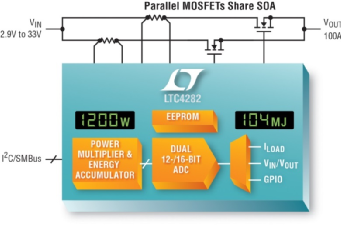 集成式电源控制与遥测解决方案 LTC4282是一款可热插拔的控制器和电路断路器,提供能量遥测功能和EEPROM(图3),凭借创新性双电流通路特色,满足了大电流应用的需求。该控制器通过控制外部N沟道MOSFET,可平滑地给大容量电容器加电,从而避免出现输入电源干扰以及电流达到破坏性水平,因此可确保电源在2.9V至33V范围内安全接通和断开。LTC4282位于通往电路板电源的入口,其准确度为0.7%的12位或16位ADC通过一个I2C/SMBus数字接口报告电路板电压、电流、功率和能耗。内部EEPROM为寄存器设置和故障记录数据提供非易失性存储,从而可在开发过程中及现场运行时,加速调试和故障分析。