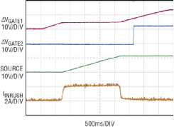 图4b:利用低应力分级起动配置实现启动:GATE1首先接通以对输出进行涓流充电(具有一个2A的低浪涌电流水平)。GATE2在SOURCE(输出)变至高于电源良好门限时接通。