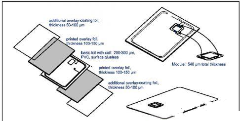图题:双接口非接触式智能卡的典型构造 addiTIonal overlay-coaTIng foil, thickness 50-100um:附加覆盖层,厚度50-100微米 printed overlay foil, thickness 100-150um:印刷覆盖层,厚度100-150微米 basic foil with coil: 200-300um, PVC, surface glueless:带线圈的基层:200-300微米,PVC材质,脱胶表面 Module: 540um total thickness:模块:总厚度540微米 在智能卡天线设计中需要考虑三个会影响卡谐振频率的主要元器件。为了使智能卡的工作距离和RF通讯稳定性等性能指标达到最佳状态,必须充分考虑到这些元器件的影响。