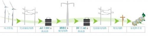 高压直流(HVDC)输电是为减少输配电损耗而实施的解决方案之一。为什么HVDC比常规交流输电更高效呢?HVDC输电线路的损耗比相同电压的AC线路少30-50%。当电压和电流变得异相时,HVDC可以提高功率因数。因为DC没有与其相关的频率,因此它不受集肤效应的影响,可以降低通过线路传输的总功率。当电流密度集中在表面或“外肤位置”时,会发生集肤效应,并且当其朝导体中心移动时会渐渐稀疏。沿表面的电流密度越高,AC的有效电阻也就越高。HVDC还提高了网络的可靠性。某些类型的HVDC站可以帮助稳定异步网络。 那么这么大量的电力如何从全国范围内传输到你家呢?电力首先从源开始,被传输到换流站,在整流为DC电压前,AC在这里被升级至所需电压。然后,电力可以作为HVDC通过远距离转移到另一个换流站,在那里被重新转换为AC,某些类型的换流站具有控制有功和无功功率的增值效益。然后变压器将AC电力提高到所需的电压,以根据需要将电压传输和配送到家庭和/或工厂。图1展示了这一完整过程。
