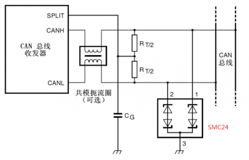 在设备工作中,CAN协议作为控制单元交互通信的主通道,其通讯速率高达1Mbps,宽输入的共模范围和差动信号技术使其像人体的神经网络,所以对CAN的保护变得至关重要。 对于汽车级的保护,ESD抗静电能力需要达到满足等同于IEC61000-4-2标准的接触和空气都要达到30KV的测试。 基于CAN的保护需求,SMC24 静电保护器件,采用SOT-23封装,工作电压24V,满足12V汽车系统产品的24V保持 1分钟的测试,同时可以同时保护2路CAN信号,由于其本身低结电容的特点,可以满足CAN通信时的数据不会丢包。